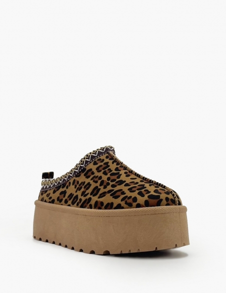 Zueco bota en pelito con plataforma de 5 cm y estampado de leopardo.