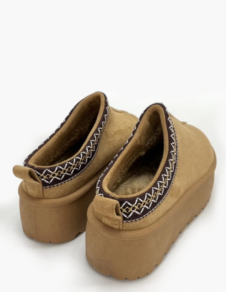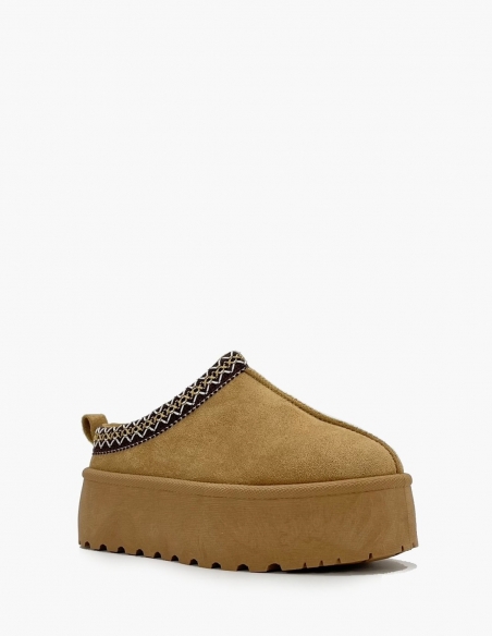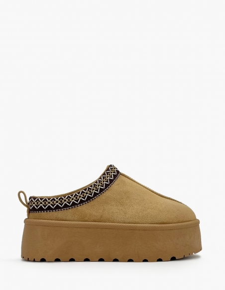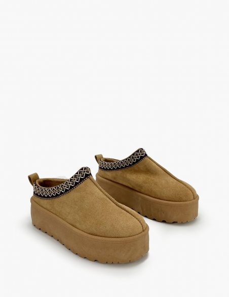 Zueco camel de pelito con plataforma de 5 cm. Estos zuecos aportaran a tu outfits ese toque moderno y actual aportando también gran comodidad en cada paso.