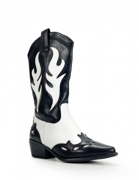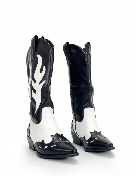 Bota cowboy de material en color negro y blanco. Este diseño moderno destaca por sus detalles en forma de llamas, con un contraste llamativo entre el blanco en la base y el negro en las zonas superiores y detalles decorativos. Con puntera en punta y tacón bajo de estilo tradicional, estas botas son ideales para quienes buscan un look western con un toque contemporáneo. Perfectas para complementar outfits casuales o de estilo vaquero con un toque de originalidad y personalidad.
