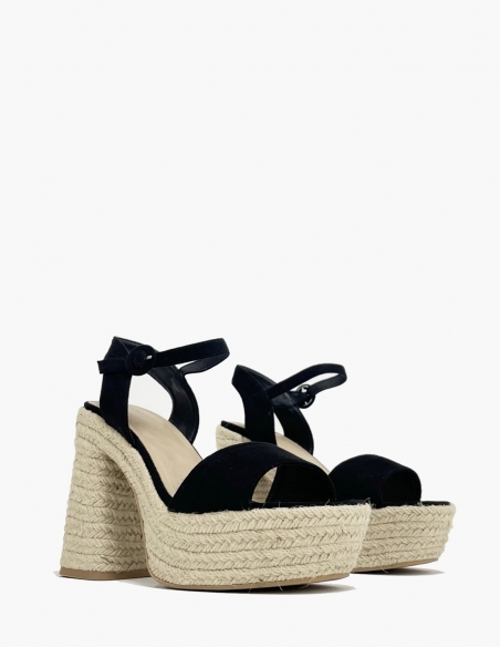 - Diseño: Sandalias de plataforma alta con tacón de bloque forrado en yute, tiras negras y ajuste con hebilla al tobillo.