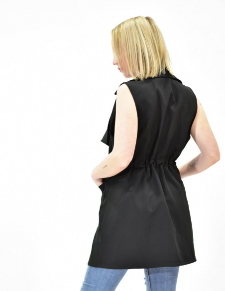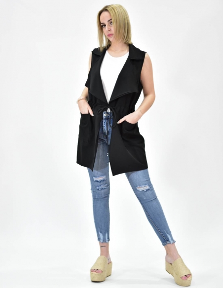 Chaleco largo, color negro, cordón en la cintura para ajustarlo como desees.