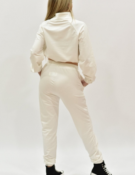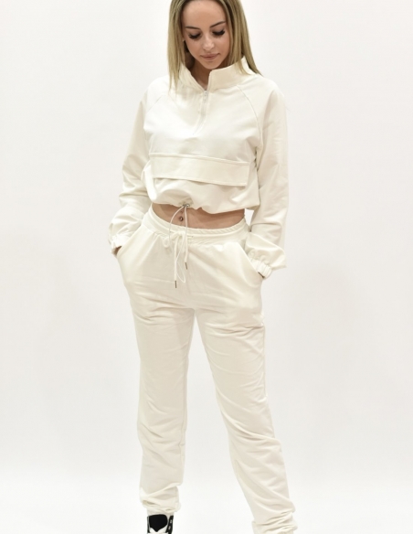 Conjunto comfy blanco,de dos piezas formado por: Pantalones joggers, cinturilla elástica con cordón ajustable, puño en el bajo. Sudadera cropped, con cordón para ajustar. La elección perfecta para ir cómoda y a la moda.