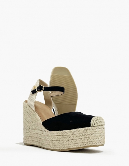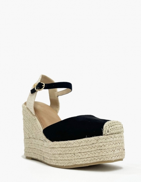 Descubre la elegancia de nuestras alpargatas de cuña alta en un sofisticado color negro. Con una impresionante cuña de 12 cm y una cómoda plataforma de 4 cm, este diseño de yute trenzado es perfecto para elevar tus looks veraniegos con estilo y confort.