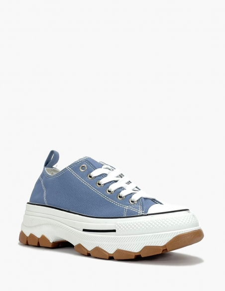 Zapatillas de plataforma en color azul con plataforma blanca de 5 cm y suela dentellada en color marrón. Son las zapas de la temporada.