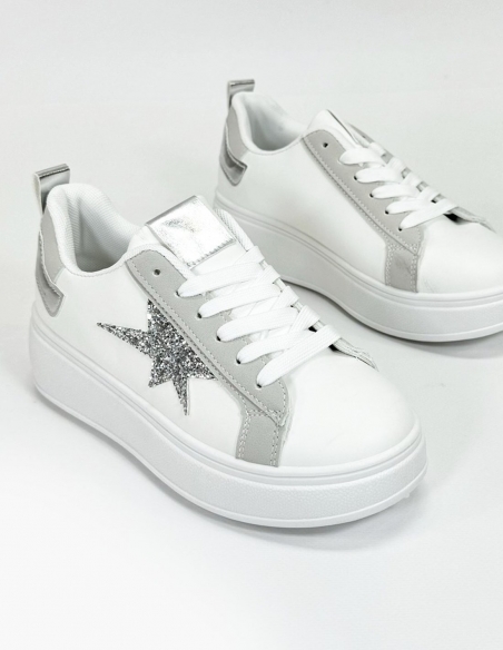 Deportivas de color blanco y plateado con estrella en gliter. Estas zapatillas de color blanco tienen plataforma y suela de goma.