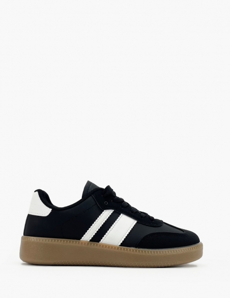 Zapatillas negras para vestir confeccionadas en piel sintética, tiene suela antideslizante en color marrón.