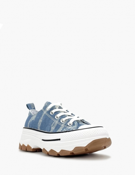 Dale un toque casual y moderno a tu estilo con estas zapatillas deportivas de mujer en tejido denim azul desgastado. Su diseño de plataforma chunky y su suela blanca robusta con detalles en goma las hacen perfectas para looks urbanos y relajados. Ideales para combinar con jeans, faldas o vestidos, estas zapatillas vaqueras ofrecen comodidad y versatilidad durante todo el día. ¡Consigue un estilo fresco y a la moda con este calzado imprescindible!