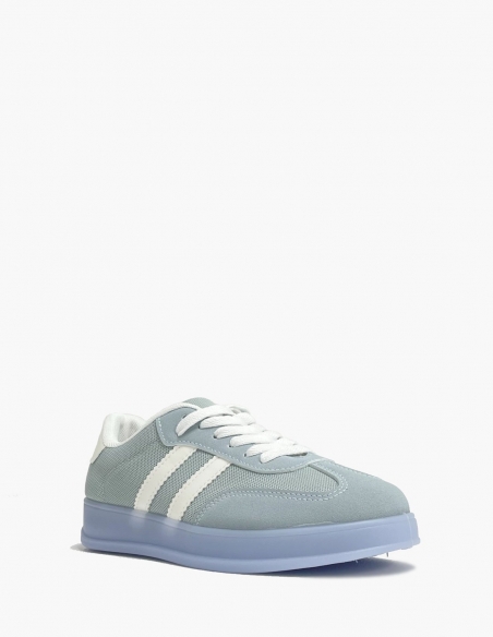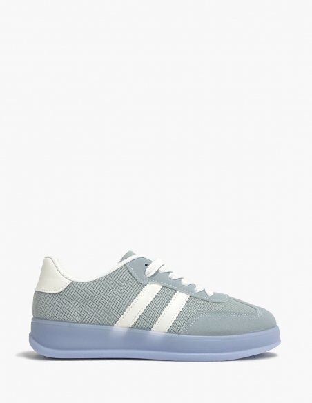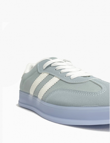 Descubre la elegancia sutil con estas zapatillas de mujer en un delicado tono azul grisáceo. Su diseño minimalista se realza con las clásicas bandas laterales en un blanco puro, aportando un contraste limpio y atemporal.
