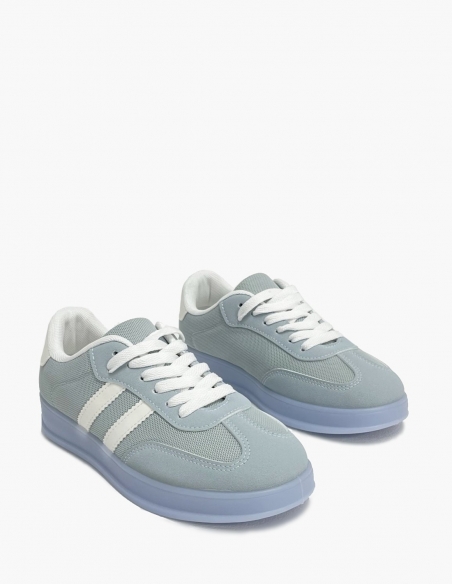 Confeccionadas en un material suave y transpirable, estas zapatillas ofrecen comodidad para el día a día. La suela de plataforma plana en un tono azul grisáceo translúcido añade un toque moderno y ligero, elevando ligeramente el look sin sacrificar la practicidad.
