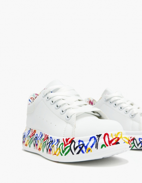 Zapatillas deportivas de mujer blancas con estampado de corazones multicolor. Descubre nuestras originales y modernas sneakers blancas para mujer con un divertido diseño de corazones pintados en varios colores. Perfectas para añadir un toque único y alegre a tus looks casual. ¡Compra tus zapatillas más originales ahora!