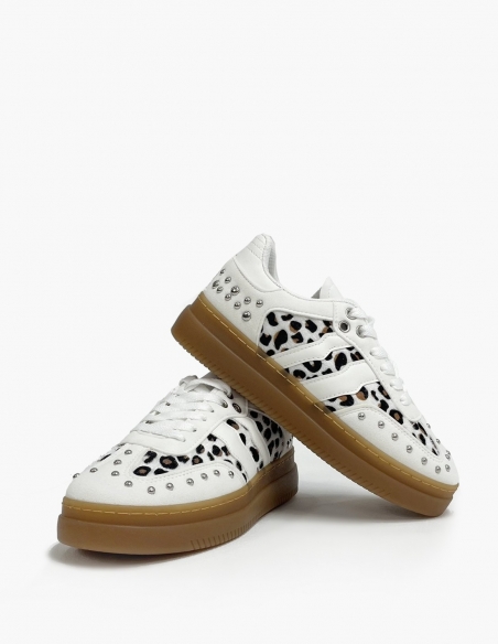 Sneakers blancas mujer con print de leopardo y tachuelas metálicas. Eleva tu estilo urbano con estas deportivas que combinan la base blanca con la ferocidad del leopardo y el brillo de las tachuelas. ¡Comodidad y personalidad en cada paso!