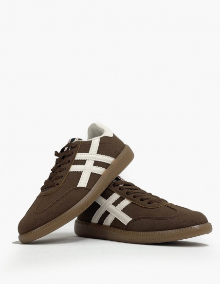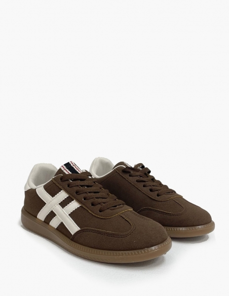 Sneakers marrones mujer estilo clásico con suela a tono y franjas blancas. Eleva tu estilo diario con estas deportivas de inspiración vintage. Suela robusta y diseño icónico que añade un aire sofisticado y fácil de combinar. ¡Comodidad y moda en cada paso!