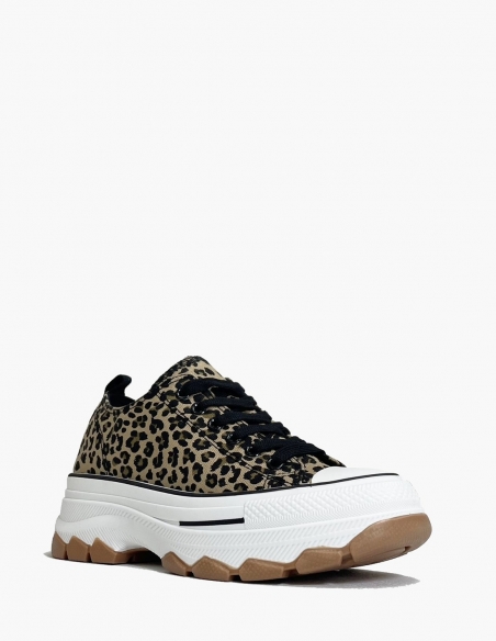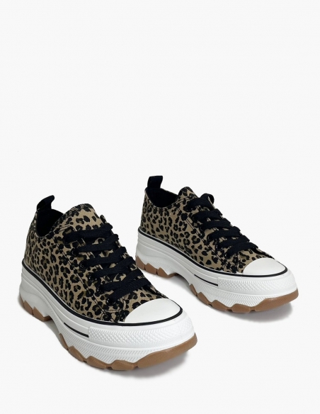 Deportivas para vestir con estampado animal print y cordoneras ajustables. Estas zapatillas con plataforma de 5 cm aportara un toque moderno a cualquier outfits con las que las combines.
