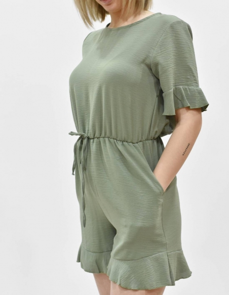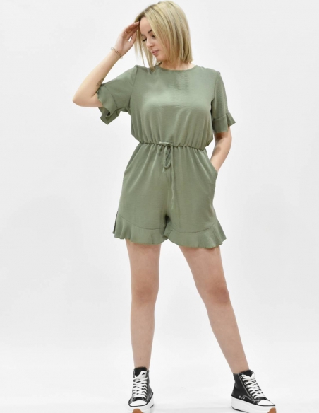 Mono de raso, pantalón corto, manga corta, color verde, detalles volantes en el bajo de las mangas y en bajo del pantalón, cintura ceñida.