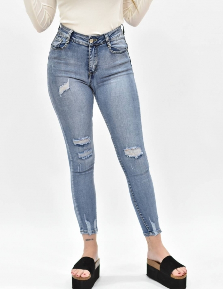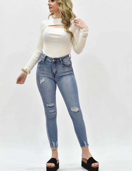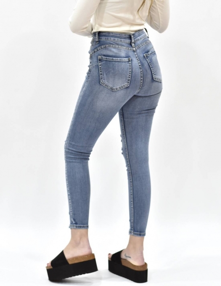 Pantalón vaquero elástico con efecto push up, detalle de rotos, al ser de tejido elástico se ajusta perfectamente a tu cuerpo y esto hará que realce tu figura y te siente genial.