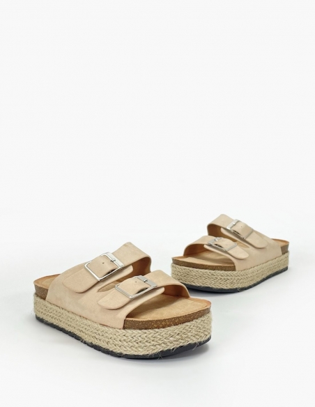 Chancla de hebillas con plataforma en color beige. Tiene suela flexible, planta acolchada y es muy ligera.