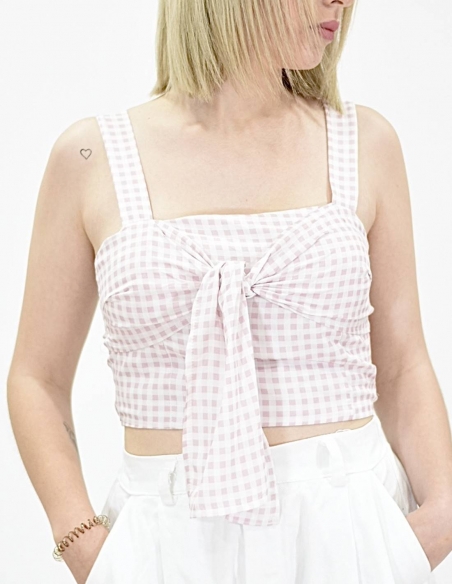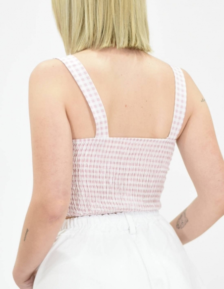 Top de tirantes, con estampado de cuadros blancos y rosas, detalle nudo delantero, nido de abeja en la espalda.