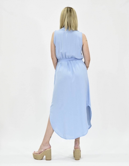 Vestido abertura delantera, color azul,cintura elástica y cinturón ajustable.