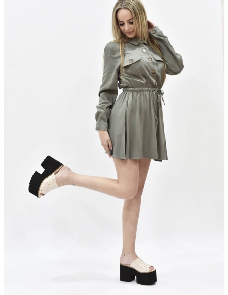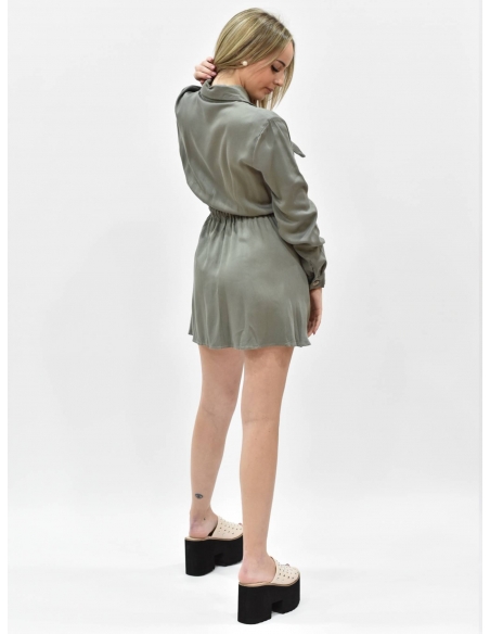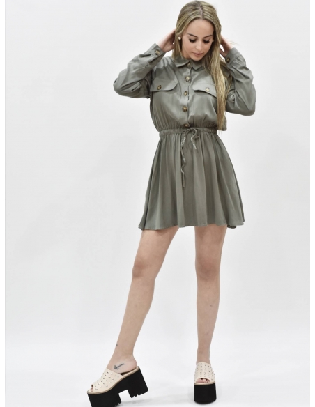 Vestido tipo camisa, color verde militar, manga larga, bolsillos superiores, cuello camisero, botones delante y cordón en la cintura para ajustarlo a tu gusto y adaptarlo a tu cuerpo. Es el vestido ideal para el entretiempo , el cual podrás combinar tanto de forma informal como formal. Un imprescindible en tu armario.