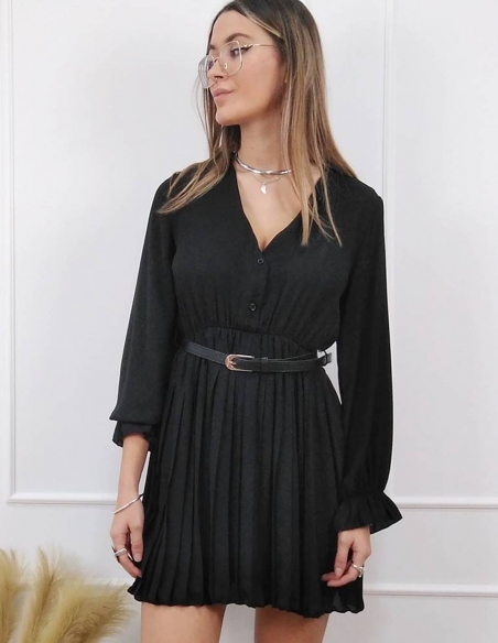 Vestido negro de mujer con cinturón y pliegues en el bajo.